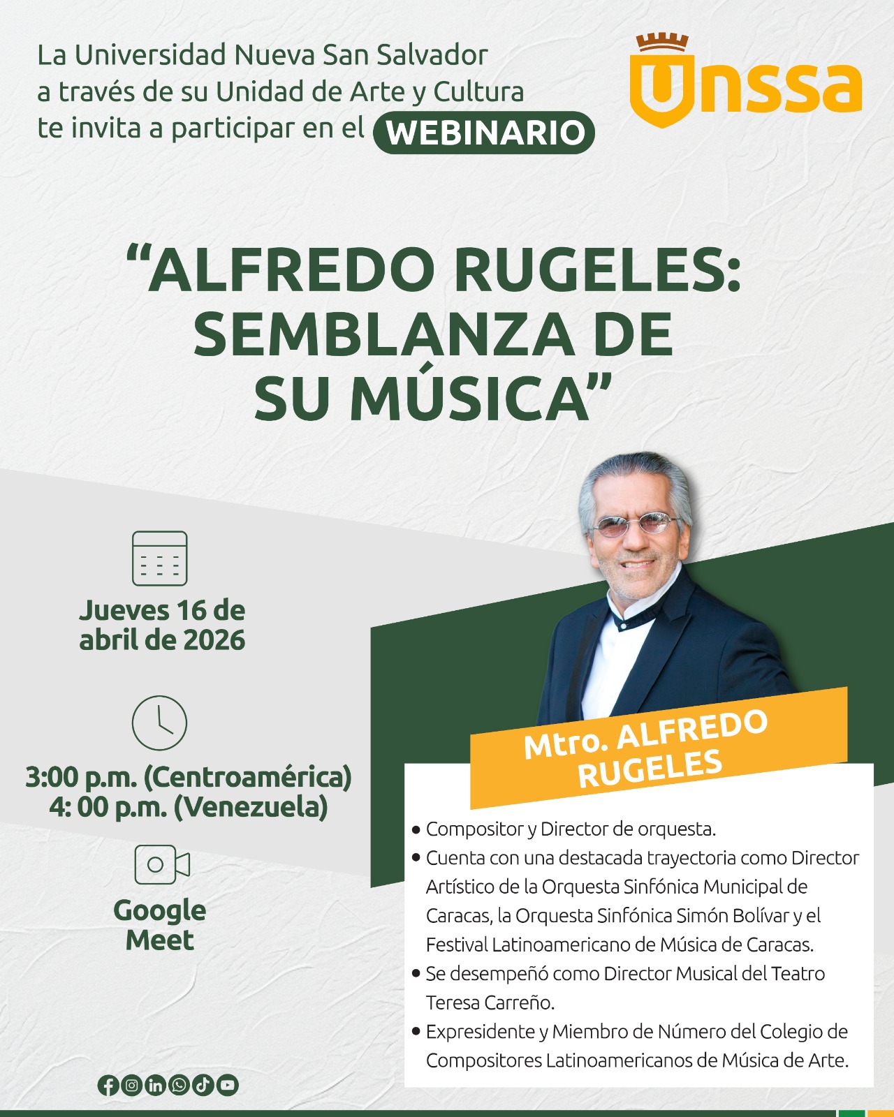 La Unidad de Arte y Cultura de la UNSSA te invita a participar en el webinario: “Alfredo Rugeles: Semblanza de su música”.