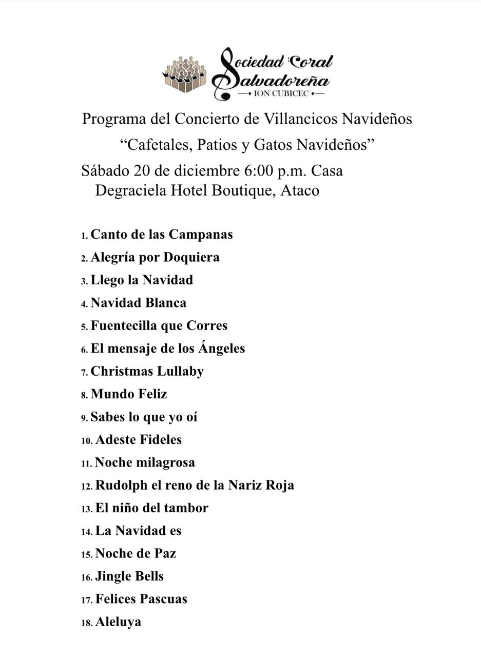 Casa Degraciela Ataco, AhuachapánSociedad Coral Salvadoreña Ion Cubicec da a conocer su programa para el concierto de villancicos.