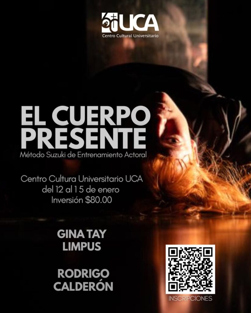 El cuerpo presenteMétodo Suzuki de Entrenamiento Actoral. 📍 CCU – UCA🗓 del 12 al 15 de enero⏰ 5:00 p. m. – 7:30 p. m.💵 Costo: $80 📲 Informes e inscripciones:+61