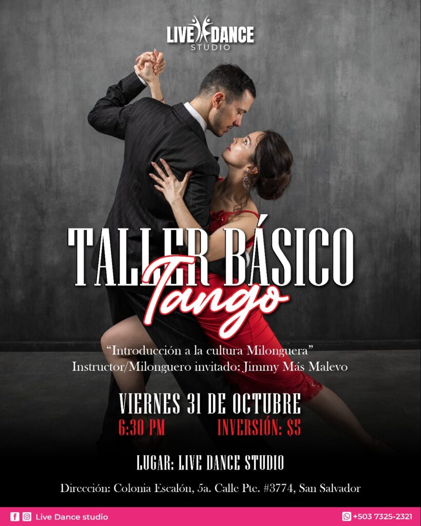 🕺💃 TALLER BÁSICO DE TANGO 📅 Viernes 31 de octubre – ⏰ 6:30 PM📍 Live Dance Studio Instructor invitado: Jimmy Más Malevo✨ “Introducción a la cultura Milonguera” 💲 Inversión: $5