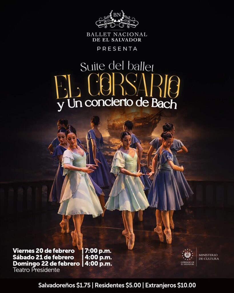El Ballet Nacional de El Salvador te invita a disfrutar de la Suite del ballet El Corsario y un concierto de Bach, una propuesta artística llena de movimiento, sensibilidad y