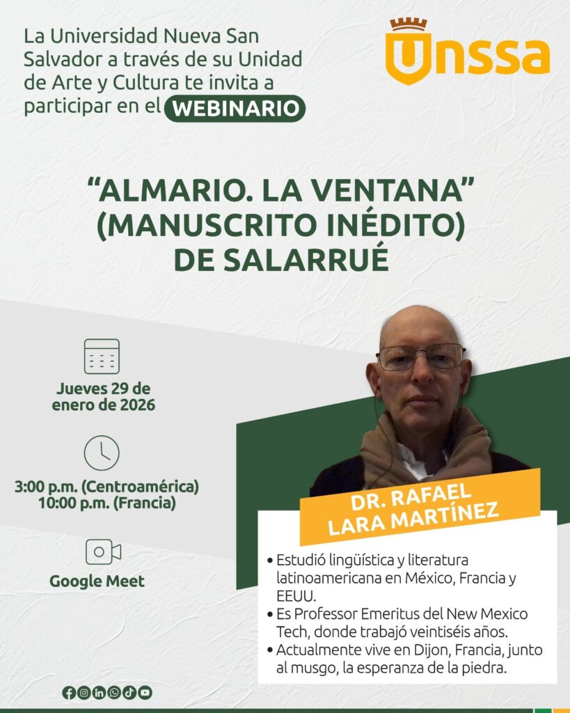 La Unidad de Arte y Cultura de la UNSSA te invita a participar en el webinario: “Almario. La ventana” (manuscrito inédito) de Salarrué. Nos acompañará el Dr. Rafael Lara Martínez. […]